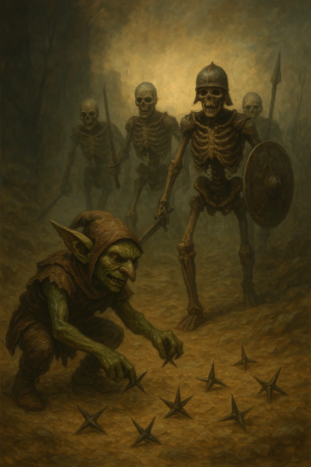 Quick-thinking Wyz scattered his caltrops across the corridor like a goblin sowing seeds of pain, then beat a hasty retreat through the eastern door. His companions followed suit, with Helfen calling upon the divine favor of Fortuna to drive back the unholy abominations. The cleric’s faith proved strong enough to send two of the skeletons fleeing into the shadows, their courage—if such creatures could be said to possess courage—failing them.