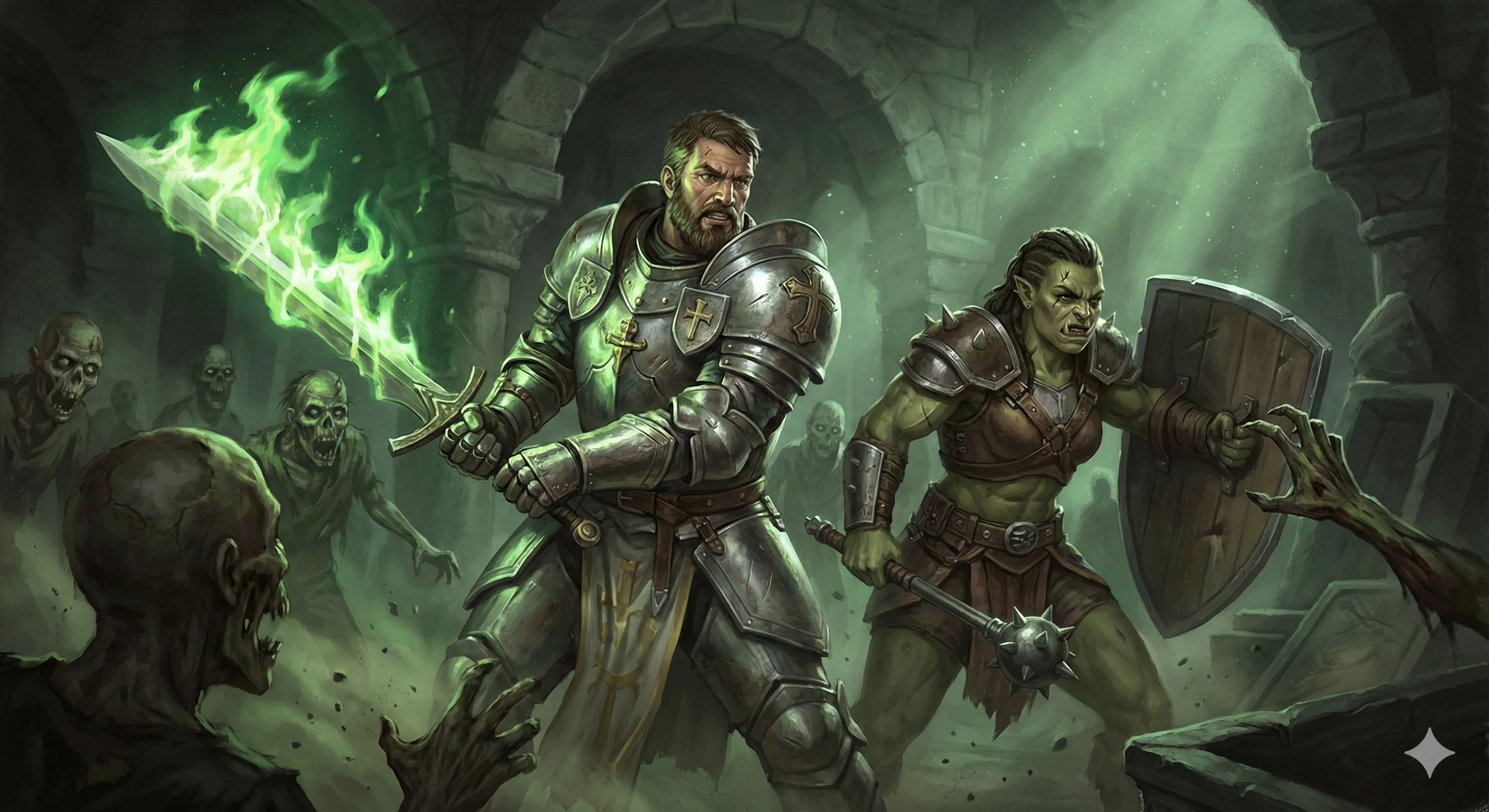 A grim understanding passed between them. They set up a defensive line before the southern door, a wall of steel and resolve. Bancroft, feeling the familiar stirrings of his faith, raised his sword and prayed. “Sylvanus, grant us your cleansing fire!” His blade ignited, not with the warm light of a torch, but with an eerie, emerald-green flame that writhed and danced, casting ghostly shadows on the walls.