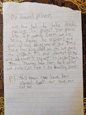 We left the party having been near-witnesses to the murder of the Duke on the night of his wedding. They captured a fleeing servant, gained access to the crime scene, and interrogated the Princess before being herded into a room to wait for the council to figure out what to do. Barron took advantage of the confusion to slip away, leabing a note.