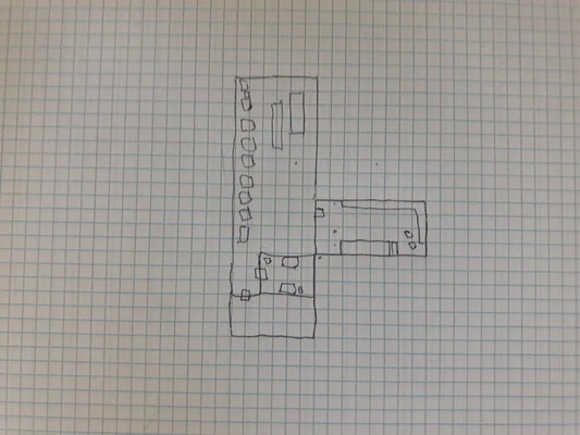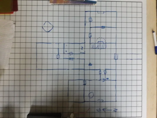 The adventure resumes where the last session left off. The party has finished their lunch while waiting for the monk to regain consciousness. After an hour or so, he did, and the party reentered the manor, resuming their explorations towards the back area of the first floor. The first room appeared to be a dining room, and was completely empty. The final set of rooms on the first floor consisted of a kitchen and a scullery, both in generally poor condition. The kitchen had a staircase leading up, and the scullery had a staircase leading down. The kitchen staircase was in poor shape and missing several of the steps.