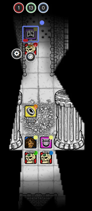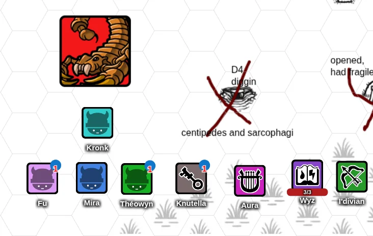 Wyz grumbled and groaned. His minions refused to obey him and return to the tomb with the tome. They insisted on opening a new barrow! And of course it was filled with ghouls hiding behind a tapestry. The undead creatures swarmed, striking Lessa and Wyz. Perch blocked the blow with his shield, but the creatures ripped it off of his arm. Wyz fell unconscious, and Lessa just stared into space, paralyzed with horror. Perch grabbed Wyz and fled with his unconscious body, leaving Lessa with a frozen look of horror on her face. After a moment the small halfling vanished from sight, confusing the ghouls, but they quickly followed the rest of the group.